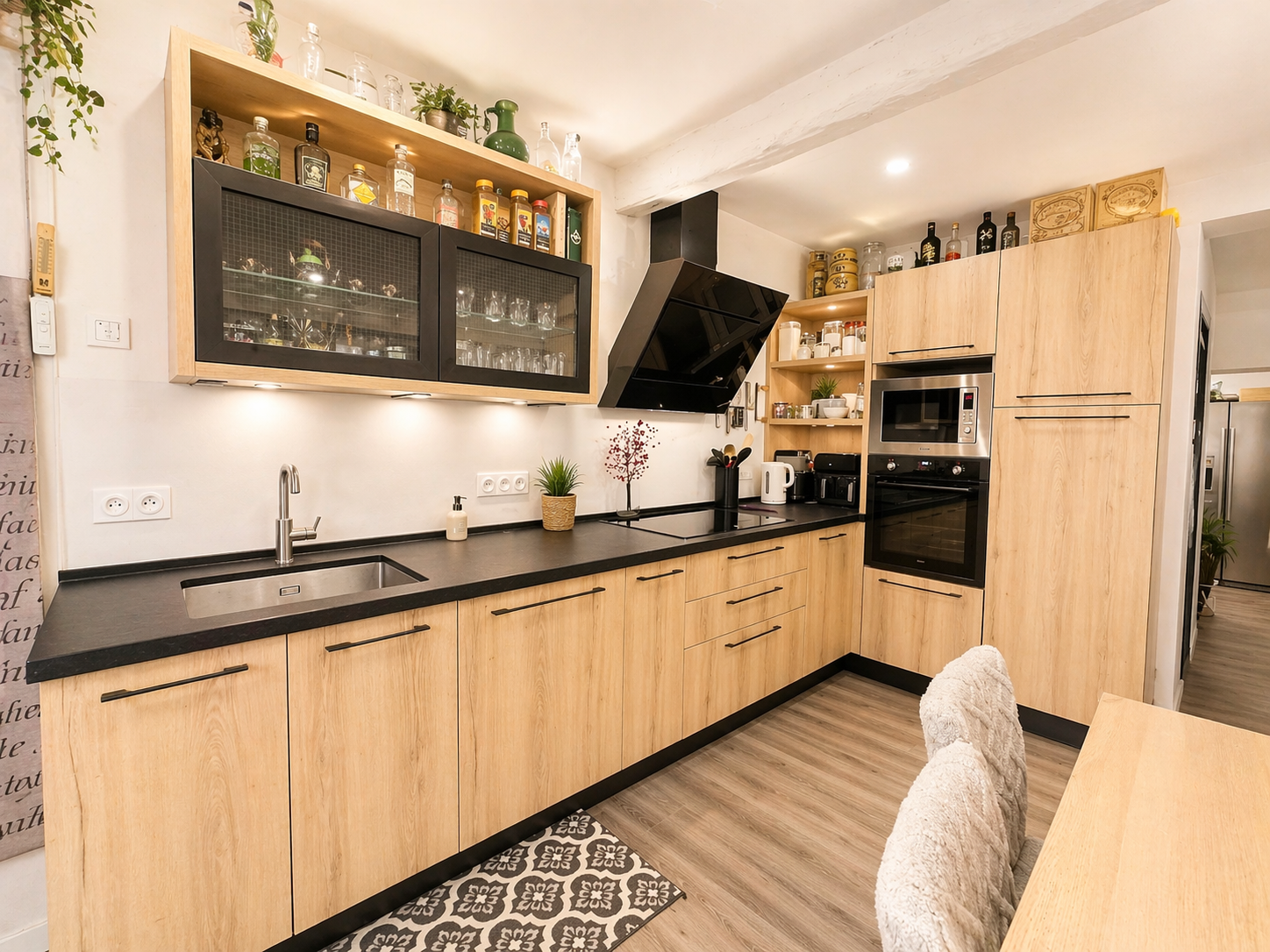 Espace cuisine aménagée et équipée (plaque, hotte, four, réfrigérateur, lave-vaisselle) ouvert sur la salle à manger, avec cellier / buanderie.