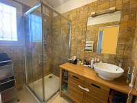 À l’étage, l’espace nuit se compose de trois chambres, dont deux équipées de climatisations réversibles, d’une salle d’eau avec sèche-serviettes et d’un WC indépendant.