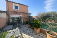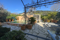 À l’extérieur, une belle terrasse dallée avec deux pergolas prolonge les espaces de vie et invite à la détente au bord de la piscine.