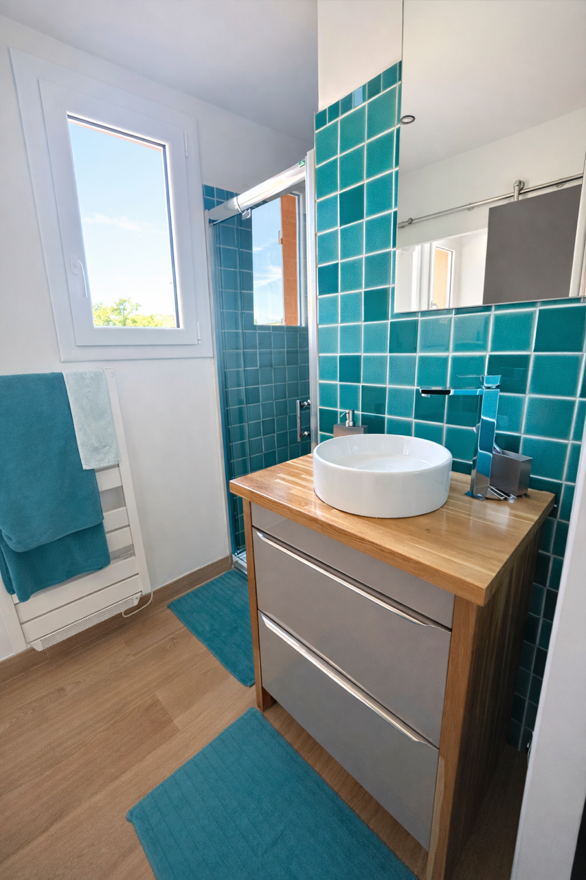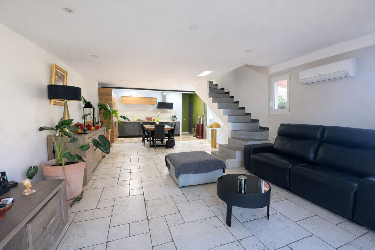 Au rez-de-chaussée, vous profiterez d’une superbe pièce de vie lumineuse d’environ 45 m² comprenant une cuisine équipée ouverte sur le salon, avec climatisation réversible. Une suite parentale avec rangements et salle d’eau privative complète ce niveau, ainsi qu’un WC suspendu indépendant et un cellier / buanderie.